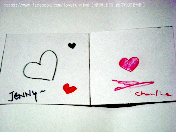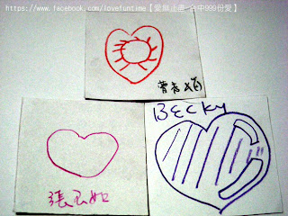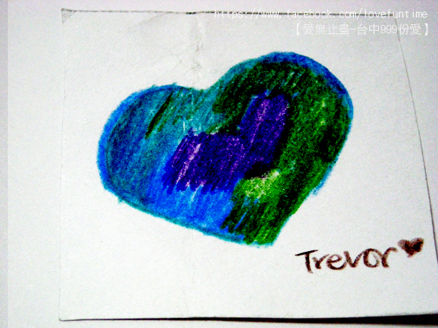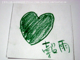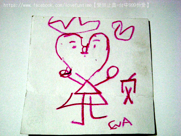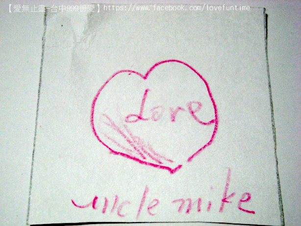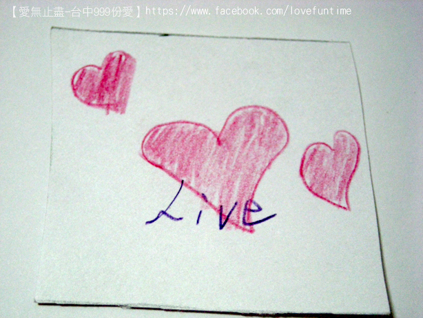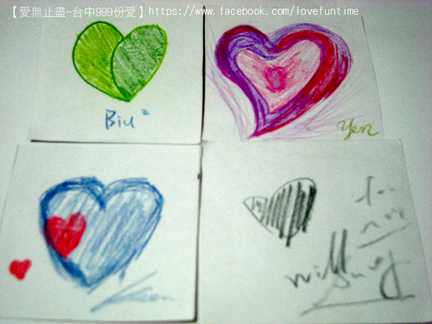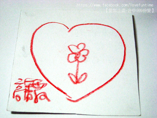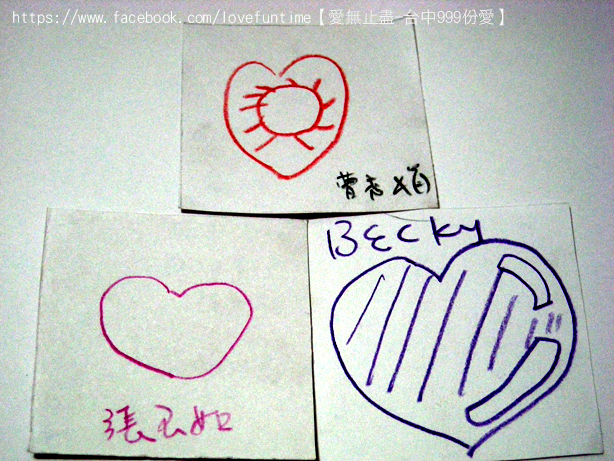 第33個,這是母子三人組,媽媽正在畫愛心的時候較小的孩子一直淘氣的抓筆桿讓媽媽畫的很辛苦,我則在旁邊不停的莞爾,之後愛心的身體是較大的女兒補上去的喔,謝謝你們的愛心~希望你們都能順利平安健康長大!