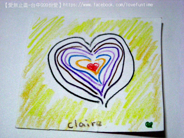 第33個,這是母子三人組,媽媽正在畫愛心的時候較小的孩子一直淘氣的抓筆桿讓媽媽畫的很辛苦,我則在旁邊不停的莞爾,之後愛心的身體是較大的女兒補上去的喔,謝謝你們的愛心~希望你們都能順利平安健康長大!